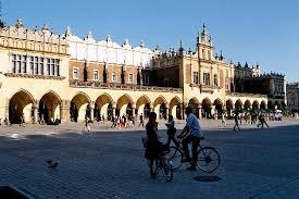 Plaza del Mercado, con la Lonja de los Paños, barbacana (restos de la muralla medieval), café en Kawiarnia Jama Michalika, famoso en la ciudad, universidad, iglesia de los franciscanos, palacio episcopal (donde vivió Juan Pablo II en su época de obispo de Cracovia).